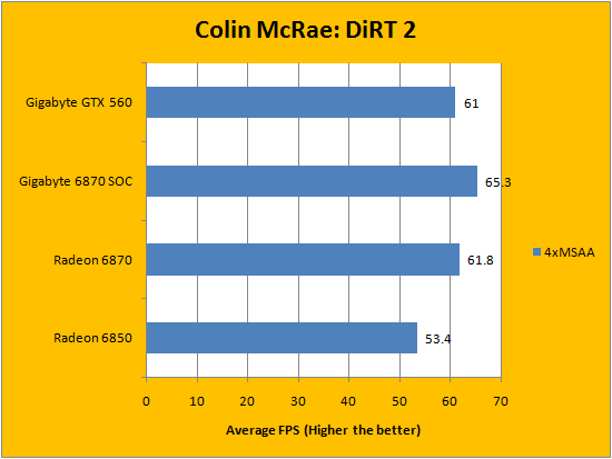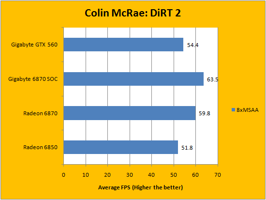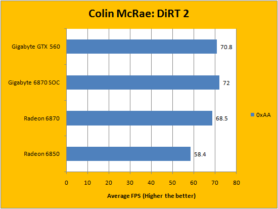 Colin McRae: DiRT 2 is a very popular game for benchmarking -- you will be hard pressed to find a review site that does not use this game in their video cards reviews. So we are no different. Despite being released over a year ago on December 1, 2009, DiRT 2 is one of the first games to make use of DirectX 11 using Codemaster's EGO engine. DiRT 2 also has an excellent in-game benchmarking function that actually reflects real life performance quite well, so we decided to give it a shot to obtain our standardized results. Once again, at 1920x1200 and everything maxed out, the Gigabyte GeForce GTX 560 1GB OC's AA/AF performance scaling characteristics resembles Call of Duty: Black Ops than that of Battlefield: Bad Company 2. We started out with the GTX 560 slotting in between the factory overclocked 6870 and the reference 6870 card. As the AA and AF increased, the GTX 560 started to drop below the regular 6870; the difference only increased as we moved from 4xMSAA to 8xMSAA.