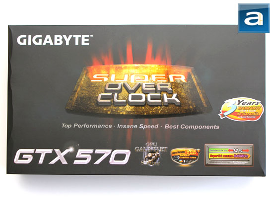 If you are sick and tired of graphics card retail boxes that would make an Apple designer want to jump off a bridge, Gigabyte would like a word with you. The GTX 570 SOC's packaging is uniquely Gigabyte, consistent across the product line, and still ensures you understand it is a video card inside the box when you are roaming your favorite local retail store. However, the flat black background is still clean and mysterious enough to captivate your attention against the competition. As you run your eyes across the center of the box, you know this is not just any GTX 570. It is the Super Overclock version -- with a firey glow around the word "super". And as anyone would know from elementary school, tacking words like "super" and "ultra" in front of anything simply makes it better. But how much better? Flip the box around, and tons of graphics with blocks of text will tell you why, but we are not here to review the box, right? So let's tiptoe around this, but before we move on, let's take a look at the specifications of Gigabyte's GeForce GTX 570 1280MB SOC, as obtained from the manufacturer's website: