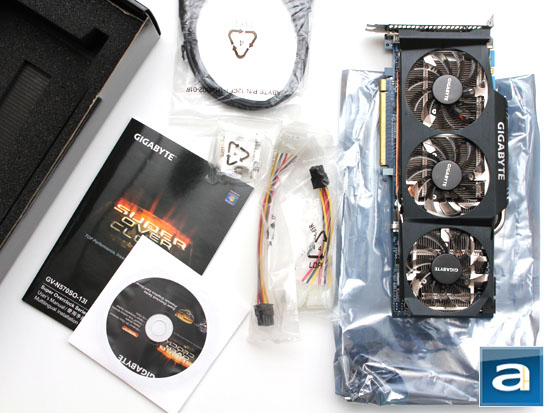 Inside the outer packaging is a thick, black cardboard flap box to protect and accommodate the actual contents. Opening the box with a shiny "Super Overclock" logo in front, a large Styrofoam block can be found with a custom shaped pit accommodates the graphics card, along with a compartment on the side that holds the accessories. Everything is carefully packaged and ensured to be in the right order when the Gigabyte GTX 570 SOC arrives in the hands of the consumer. Out of the box, you will receive the following contents: