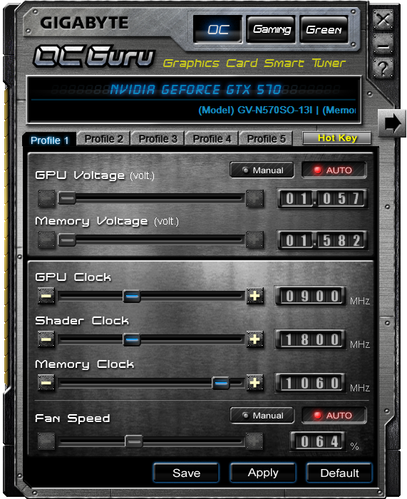 One of the best things about Gigabyte's SOC graphics cards is the company supplies a program called Gigabyte OC Guru. As its name suggests, it is a utility used for tuning the performance of your video card. It allows the voltage of your GPU and memory to be adjusted for overclocking, fan speed control, as well as power saving features. With the latest software revision, I got it installed on my test platform, and immediately got to work. The simple condition for my overclocking procedure is to see how far I could go without adjusting the voltage. As you can see in our screenshot above, the GTX 570 core did surprisingly well in this area -- Gigabyte already has an aggressive overclock from the factory, but we managed to squeeze another 55MHz from that. The net figure is 900MHz, which translates to an awesome 23% over NVIDIA specifications, or 6.5% over Gigabyte specifications. It seems to me other review websites were able to get this card much closer to 1GHz than I could. I am not entirely how they verified their overclocks, but I also scan for artifacts in Furmark in addition to testing for stability. Since Gigabyte neglected to overclock the memory from the factory, here is where our work comes in handy. Starting from 950MHz, Samsung K4G10325FE-HC04 memory ICs reached 1060MHz without any problems, or 11.6% over NVIDIA specifications. Although this result is not particularly earth shattering, I am quite pleased with it nonetheless.