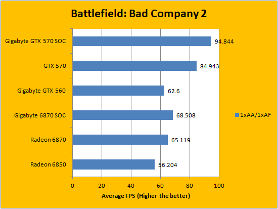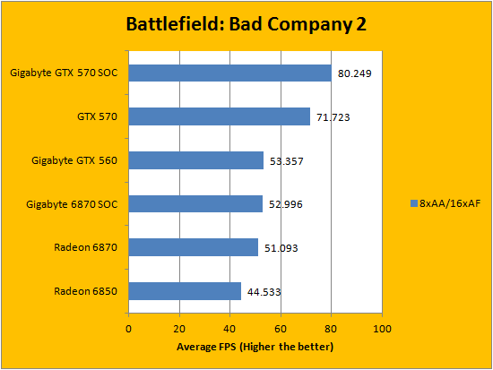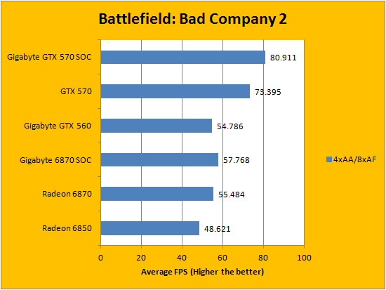 Battlefield: Bad Company 2 runs off the Frostbite 1.5 engine, developed by EA Digital Illusions CE. It is a DirectX 11 game, released on March 2, 2010. We benchmarked our graphics cards on the Heart of Darkness level with everything maxed out at 1920x1200; the only manipulated variable is anti-aliasing and anisotropic filtering, as reflected on the labels in our graphs above. Since Bad Company 2 does not have built in benchmarking tools for custom timedemos, we ended up playing the same level manually in the same manner repeatedly to obtain our results. Once again, the higher market GTX 570 dominated the midrange cards used in our tests, which is to be expected. At at average of 15-20fps ahead of its closest competitor, the GTX 570 did very well consistently. However, as much as history repeats itself, the Gigabyte GeForce GTX 570 1280MB SOC held its own with a considerably decent margin against a generic NVIDIA GeForce GTX 570 video card.