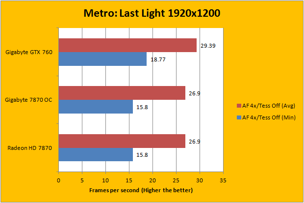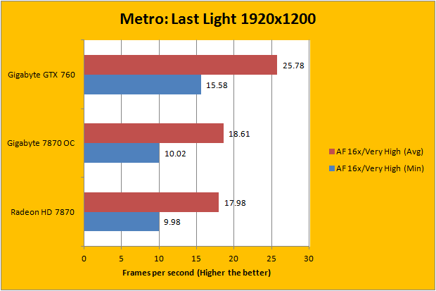 Ever since Metro 2033 has been released into the market a few years ago, it was an instant hit among reviewers for benchmarking. The reason why everyone is so interested in using Metro 2033 to benchmark is because it is like the Crysis of benchmarking... except, of course, we use Crysis in our battery of standard tests here at APH Networks, but that is another story. Released on May 14, 2013, Metro: Last Light is the latest iteration published by 4A Games, and runs off the company’s 4A Engine. Unlike a number of other games we have used to test video cards in this review, Metro: Last Light comes with a pretty good benchmarking tool out of the box, so we gave it a shot. Again, the game is quite taxing on our hardware; with all the settings maxed out and adjusting only AF and tessellation, we can’t even break the thirty average frames per second barrier. As expected, the Gigabyte GeForce GTX 760 delivered quite a bit higher framerate than the reference AMD card. Again, we are not directly comparing the two, since they occupy different market positions. The figures can be seen in our graphs above.