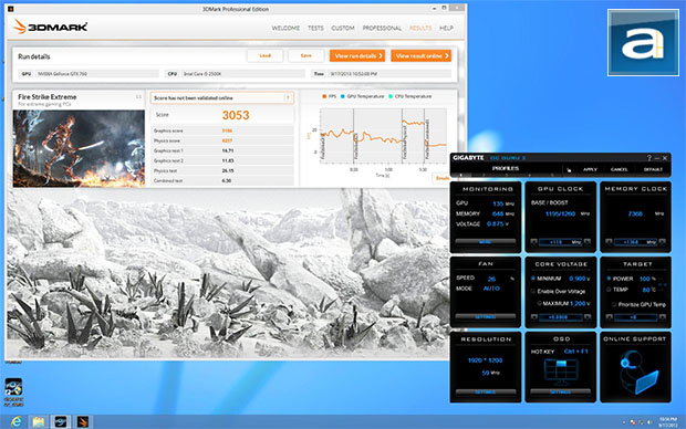 Our Gigabyte GeForce GTX 760 2GB was able to clock 22% over NVIDIA base clocks for both core and memory. To see how it performs, I ran Fire Strike Extreme in 3DMark, and got a score of 3053. The Gigabyte GeForce GTX 760 2GB (Which is overclocked slightly from the factory) delivers a score of 2877 in base form, which is not bad at all.