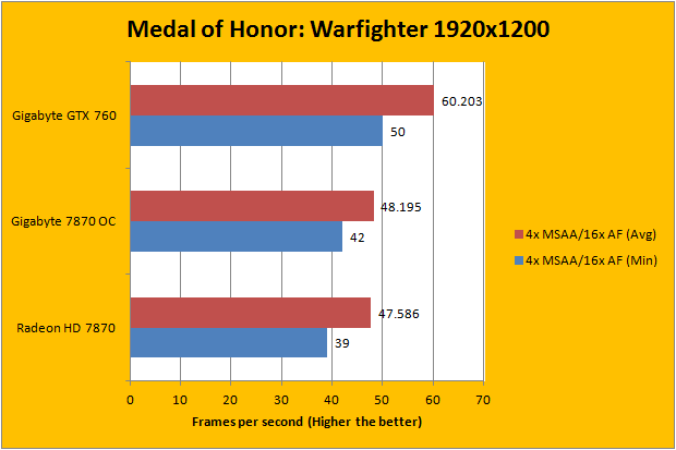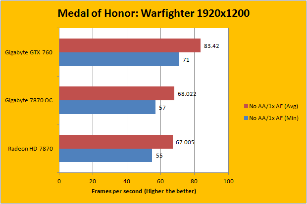 Developed by Danger Close Games and released on October 23, 2012, Medal of Honor: Warfighter is a direct sequel to Medal of Honor released in 2010. This first person shooter title is the fourteenth title in the series. Again, this is a DirectX 11 game that runs of DICE’s Frostbite 2 game engine. As with our other gaming benchmarks, we maxed out all the effects, and only adjusted AA and AF at 1920x1200. Our custom benchmark run is done on the “Unintended Consequences” level, beginning with Preacher blowing up the truck. It is a reasonably demanding sequence, is fairly repeatable, and it should be quite representative of the kind of performance we can expect out of our hardware in this game. As you can see in our graphs above, Medal of Honor: Warfighter is not extremely hardware demanding; all of the tested cards can run the game reasonably smoothly. Again, as expected, our more expensive and newer Gigabyte GeForce GTX 760 2GB delivered a good chunk of extra speed over the Radeon HD 7870 2GB. I will let you interpret the graphs yourself.