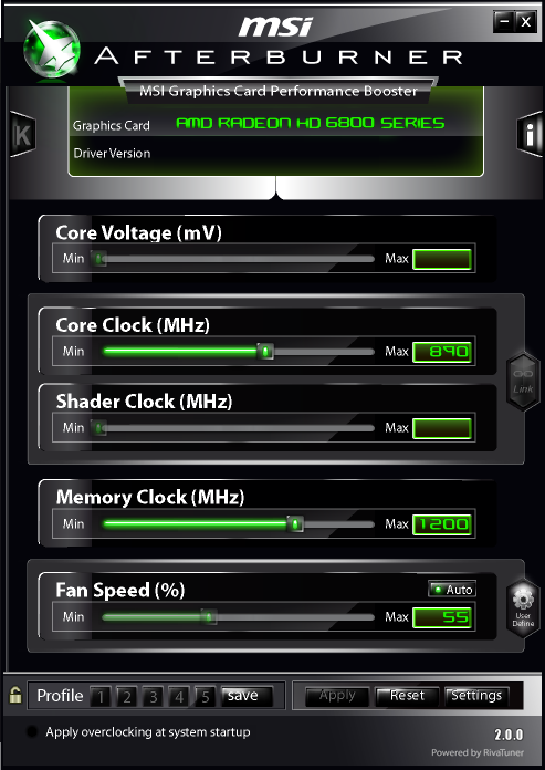 Since Gigabyte does not offer any overclocking software out of the box, we happily headed over to their competitor's website and downloaded MSI Afterburner. Even though the Gigabyte GV-R685OC-1GD Radeon HD 6850 1GB OC is a non-reference card and its voltage cannot be increased by any readily available program, this card actually exceeded what Catalyst Control Center's in-built Overdrive overclocking feature is capable of providing. AMD only allows the user to take it up to 875MHz core/1200MHz memory from the drivers. Fortunately, this can be circumvented by using MSI's Afterburner program by changing the "EnableUnofficialOverclocking" variable to '1' in the MSIAfterburner.cfg file. As shown in our screenshot above, we were able to hit 900MHz core and 1200MHz (4800 effective) memory at stock voltage. That's a commendable 16.1% core overclock and 20% memory overclock from reference (9.8% and 14.3% from Gigabyte's factory overclock, respectively). With a small voltage increase, many users on various forums are raving about how much their 6850 overclocks, and it seems that Gigabyte left GV-R685OC-1GD owners out in the cold to further unlock its potential.