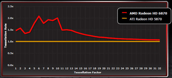 Its features are quite similar to AMD's previous generation graphics cards. New stuff includes an update to DisplayPort 1.2 ready specifications and HDMI 1.4a compliance, and introduction to a new format of anti-aliasing called Morphological AA. Tagging along is the company's HD3D and UVD3 technology. Improved anisotropic filtering and tessellation performance due to better thread management and buffering compared to the 5800 series is also part of the package. AMD maintains its rotational invariance AF of the 5800 series, and claims the 6870 has twice the tessellation performance of the 5870. From AMD's internal testing results, we can see AMD has focused on tessellation performance at lower tessellation factors between 6 and 10 to back their claims. Between factors of 1-5 and 11-13, the tessellation rate compared to the Radeon 5870 is in the 1.5x range; and continues to decrease from there. AMD believes the lower factors are more crucial for gaming purposes.