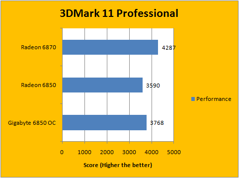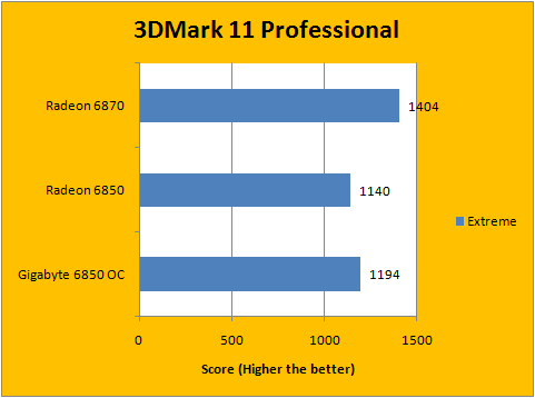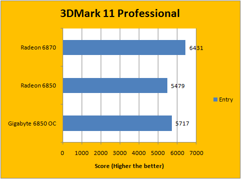 3DMark 11 is available in three presets; separated into their respective categories of Entry, Performance, and Extreme. Entry is run at a resolution of 1024x600, Performance at 1280x720, and Extreme at 1920x1080. Being a new benchmark on the market -- released only last month -- Futuremark's latest program is more than capable of driving current generation graphics cards to its knees. And it did. It takes advantage of new DirectX 11 features such as tessellation, compute shaders, and multi-threading. In the Entry test, Gigabyte Radeon 6850 OC is 11% slower than the 6870, and 4.2% faster than a stock 6850. Similar differences can be observed for Performance and Extreme presets. Its relative performance is 12% slower than the 6870 and 5% faster than a stock 6850 in Performance, and 15% slower than the 6870 and 4.7% faster than a stock 6850 in Extreme.