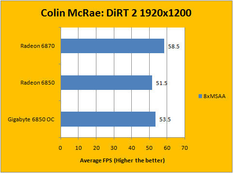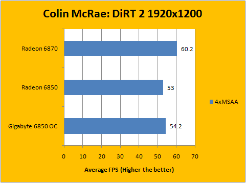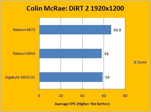 Colin McRae: DiRT 2 is a very popular game for benchmarking -- you will be hard pressed to find a review site that does not use this game in their video cards reviews. So we are no different. Despite being released over a year ago on December 1, 2009, DiRT 2 is one of the first games to make use of DirectX 11 using Codemaster's EGO engine. DiRT 2 also has an excellent in-game benchmarking function that actually reflects real life performance quite well, so we decided to give it a shot to obtain our standardized results. Once again, at 1920x1200 and everything maxed out, the factory overclocked Gigabyte Radeon HD 6850 1GB delivered a 1-2 fps increase over a stock 6850, but stayed a good margin of approximately 6 fps behind our reference AMD Radeon HD 6870 depending on anti-aliasing settings.