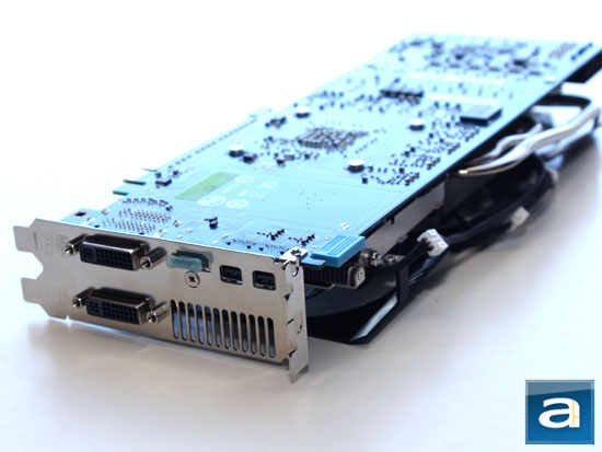 Turning the graphics card around, Gigabyte's signature blue PCB can be seen more clearly. From an aesthetics point of view, I have never really liked Gigabyte's blue motherboards in my windowed case, but as far as graphics cards are concerned that has never really been a problem for me. All connectors come with a blue cap out of the box for extra protection. Like all modern midrange to high performance video cards, the Gigabyte Radeon HD 6870 1GB SOC occupies two slots, and the rear connector panel takes advantage of this configuration. One DVI-I port is found at the top, while a DVI-D port is situated at the bottom. Residing next to it is an HDMI connector, followed by two mini-DisplayPort connectors. A small vent is implemented into the backplate's remaining space for direct heat exhaust outside the chassis. Internally, its CrossFire bridge connector is located on the left side of the outer edge. And finally, I don't think I need to mention this, but just in case, the connection interface is PCI Express 2.1.