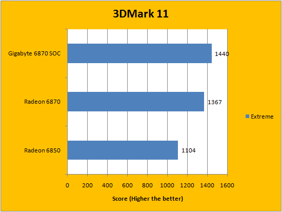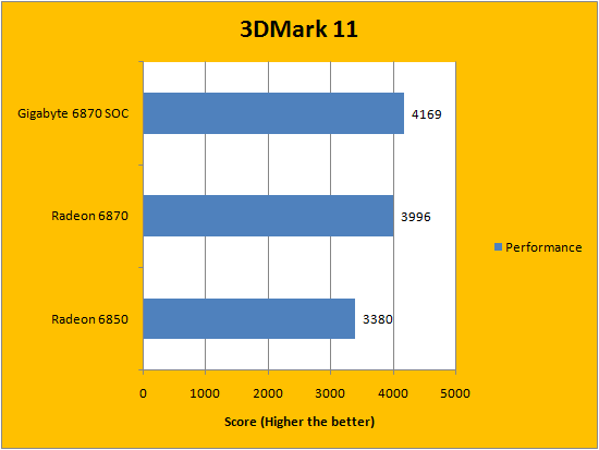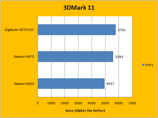 3DMark 11 is available in three presets; separated into their respective categories of Entry, Performance, and Extreme. Entry is run at a resolution of 1024x600, Performance at 1280x720, and Extreme at 1920x1080. Released on December 7, 2010, Futuremark's latest program is more than capable of driving current generation graphics cards to its knees. And it did. It takes advantage of new DirectX 11 features such as tessellation, compute shaders, and multi-threading. In the Entry test, the Gigabyte Radeon HD 6870 1GB SOC is 17.1% faster than a stock 6850, and 3.4% faster than a stock 6870. As we scale up to the Performance preset, these values changes to 23.3% and 4.3%, respectively; while on Extreme, the gap increases to 30.4% and 5.3%, respectively.