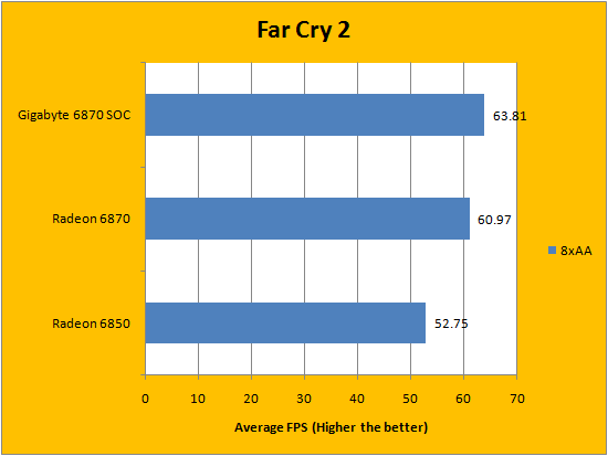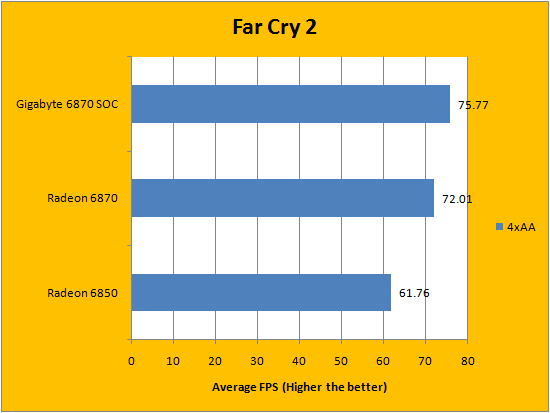 Far Cry 2 is the oldest game in our array of benchmarks. Released on October 21, 2008, Far Cry 2 uses a heavily modified version of the Dunia Engine with Havok Physics. This DirectX 10 game comes with an excellent benchmark utility that quite well reflects in-game performance, so again, we decided to use it to obtain our results for our graphs above. At 1920x1200 and everything maxed out, the Gigabyte Radeon HD 6870 1GB SOC wasn't a whole lot faster than a reference 6870; but the difference can clearly be seen between the 6870 and 6850.