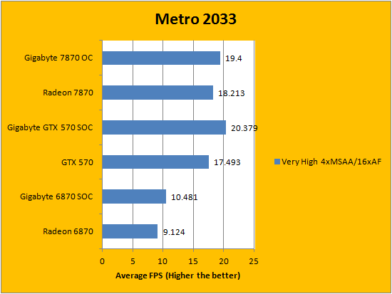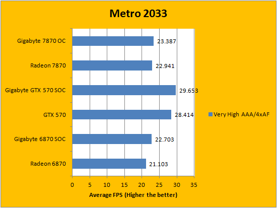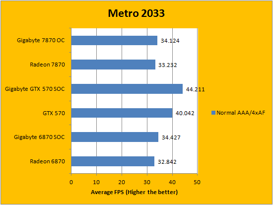 Metro 2033 is another favorite benchmark for reviewers, because once you turn the settings up, this game can easily murder any graphics card your system has. Released on March 16, 2010 and running off the 4A Engine, this DirectX 11 game is perfectly playable with more than acceptable graphics at less than maximum settings. For the purpose of benchmarking, our custom test involves a run through the Bridge level, and we obtained three different sets of data, as posted above. The first one was on 'Normal' details on AAA/4xAF. Despite hovering around the 30 to 40fps mark, the game was smooth enough for the most part; but once you max out the details to 'Very High', frame rates dropped easily into unplayable levels. We did not notice a big improvement for the Radeon HD 7870 compared to the previous generation 6870 card until we started maxing out the game -- where the former delivered very significant performance gains. It wasn't until then that the stock 7870 finally pulled out ahead of the stock GTX 570 as well, as you can see in our graphs above.
