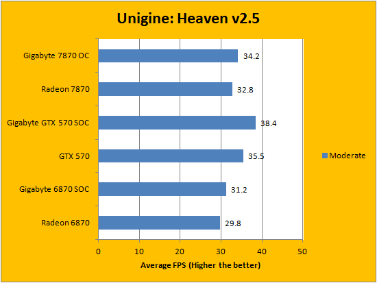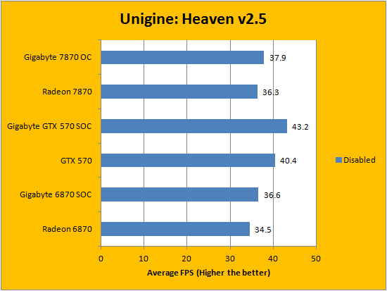 Unigine's Heaven v2.5 shows users what the company's game engine is capable of. Developed in 2009, one of the biggest features of Unigine is its advanced OpenGL 4.0 and DirectX 11 renderer. This is an excellent benchmark, because there are currently fourteen Unigine licenses used for game development at press time. For our tests, we left it at its maximum settings of 8xAA and 16xAF, using tessellation as its only manipulated variable to measure the respective performance of the tested graphics cards. The average frame rate is shown in our charts above. The AMD Radeon HD 7870 did not post huge gains over its predecessor until we got close to maxing out on the tessellation. Unfortunately, it did not do that well with full on AA and AF, where the NVIDIA card benefited from better performance scaling in this regard.