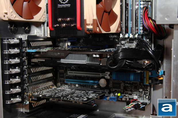 Four spring loaded screws with clear plastic washers are located on top of the board to hold the heatsink to the card. Once the four screws were unscrewed, the heatsink came off very easily. With its dual heatpipe and triple fan configuration, Gigabyte promises its WindForce 3X design runs considerably cooler than AMD's reference stock heatsink. We will post actual temperature results shortly. Our photo above should provide a little more insight into the hardware used on Gigabyte's Radeon HD 7870 2GB OC card. Two 6-pin PCI Express power connectors are still located on the outer edge of the board facing towards the side of the chassis -- but for its non-reference design, Gigabyte has 100% Japanese brand solid state capacitors, ferrite core/metal choke, and lower RDS(on) MOFSET for improved reliability, lower power consumption, and lower heat output. Combined with its 2oz copper PCB, Gigabyte markets this as its Ultra Durable design. Every Gigabyte video card I have reviewed in the past has been used in production machines here at APH Networks, and I have never experienced any reliability issues at all.