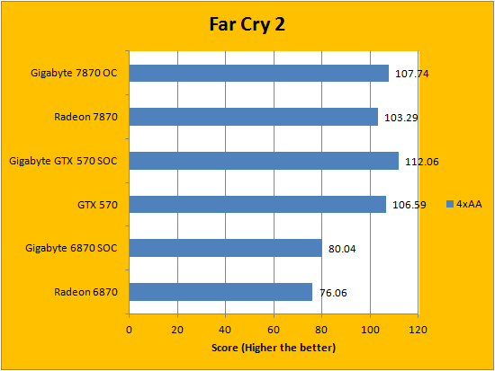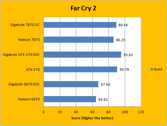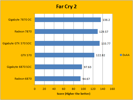 Far Cry 2 is the oldest game in our array of benchmarks. Released on October 21, 2008, Far Cry 2 uses a heavily modified version of the Dunia Engine with Havok Physics. This DirectX 10 game comes with an excellent benchmark utility that quite well reflects in-game performance, so again, we decided to use it to obtain our results for our graphs above. At 1920x1200 and everything maxed out, we are back to another swap session, except this time, the GeForce cards scaled better than the Radeon contestants in antialiasing adjustments. In this benchmark, the Gigabyte Radeon HD 7870 2GB OC posted significant gains over its predecessor, but it did trade some punches with the GTX 570.