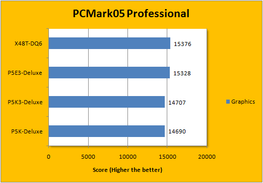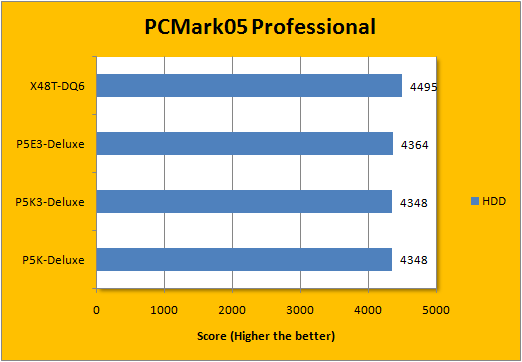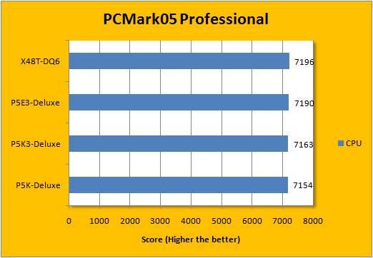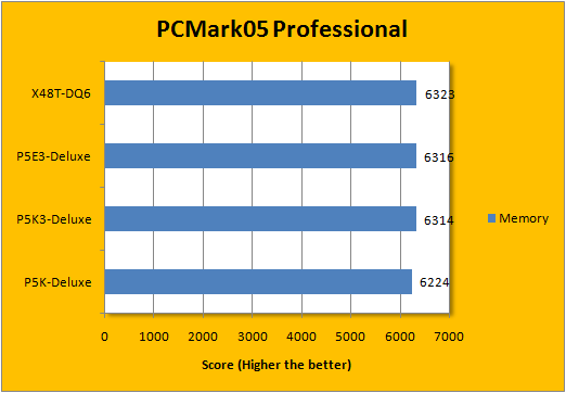 In Futuremark's PCMark05 application, the P5E3-Deluxe again kept a very close run behind the X48T-DQ6 -- where the Gigabyte board had very minor point differences and can be generally counted as statistically tied. That aside, the X38 and X48 again outperformed the P35 boards by a margin; it's quite distinguishable that the P35 boards, whether DDR2 or DDR3, was really close to each other; just like how the X38 and X48 DDR3 boards are both at the tails of each other.