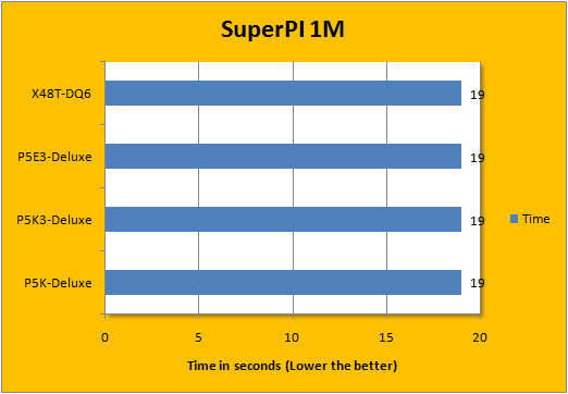SuperPI to one million digits generally aren't affected by the motherboard, but to measure and verify consistency we implemented this benchmark. All four motherboards are consistent in this area and obtained a time of 19 seconds with our 1600MHz FSB QDR Core 2 Duo CPU.