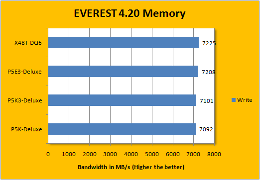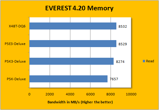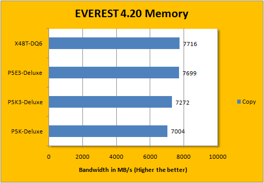 Our Asus P5K-Deluxe DDR2 board uses OCZ Reaper HPC 2x1GB RAM running at DDR2-800 4-4-4-10 (Micron D9GMH chips), while our compared DDR3 based P5K3-Deluxe, P5E3-Deluxe, and Gigabyte X48T-DQ6 motherboard uses OCZ ReaperX 2x1GB RAM running at 6-5-5-18 DDR3-1200 speed (Micron D9GTS chips). DDR3 outperformed DDR2 RAM by a margin; with the X38 and X48 chipsets showing significantly better memory controllers for much better performance, as shown in our charts. The X38 P5E3-Deluxe was again very close in performance to the X48T-DQ6 based off the X48 chipset; with the Gigabyte board again leading by an insignificant but present margin.
