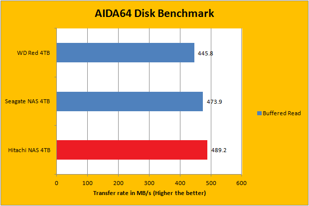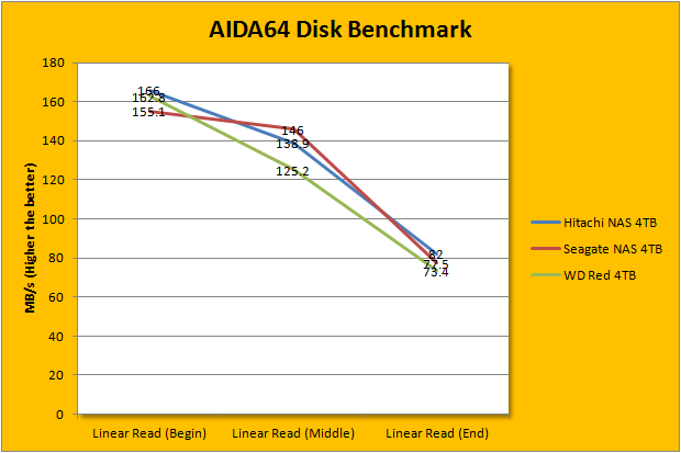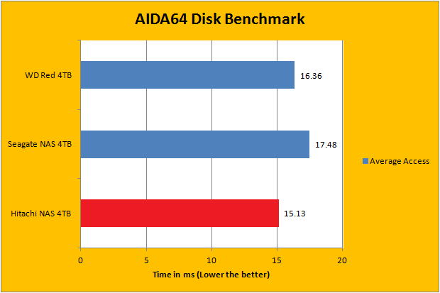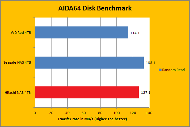 Since our storage review benchmark results are presented in alphabetical order, first up on the list are results from one of our favorite benchmarking programs, AIDA64 Engineer. Just to note, AIDA64 Engineer is a full synthetic benchmark. Unlike full synthetic motor oil, this usually does not always carry a good connotation. While it is not a representation of real life performance (Such as how fast you can copy movies to your drive), it does provide valuable insight into performance variation between drives from different manufacturers. As you can see in our graphs above, the Hitachi Deskstar NAS 4TB, being the only 7,200 RPM hard disk in the test, scored the most amount of first places in this set of benchmarks. Meanwhile, the Western Digital Red started off mid pack in the beginning of the drive, but dropped off to last place in the Linear Read test as we move in to the middle and end of the drive. Seagate's 5,900 RPM NAS HDD ST4000VN000 4TB and Western Digital's 5,400 RPM Red WD40EFRX 4TB duked it out for the remainder of the results. As expected, the Deskstar NAS produced the best random access time result of 15.13ms. The Western Digital came in just behind at 16.36ms, and Seagate at 17.48ms.