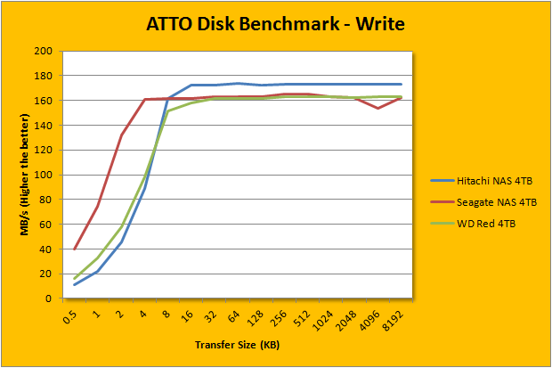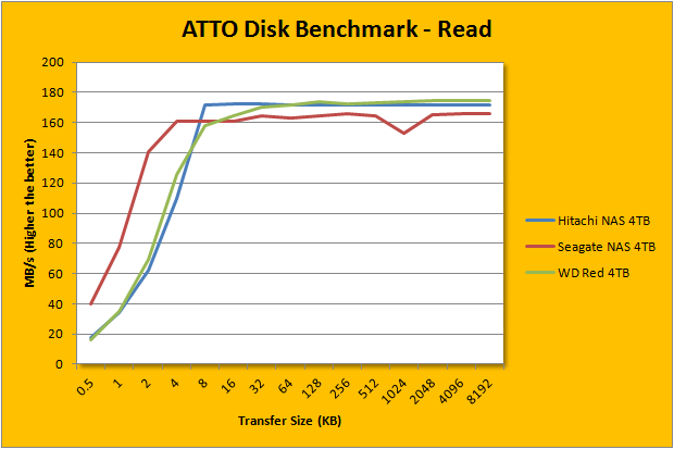 Following up next is our usual ATTO read and write tests. ATTO is an often quoted benchmark, because it is easy to use and accurate. For the most part, it is a favorite among reviewers, and I have grown to embrace it as much as the next for the last little while. By varying the file transfer size, you can visually see how each product performs across the curve. In this Hitachi versus Western Digital versus Seagate shootout, it was rather hard to define a clear winner. In small file transfer sizes -- up to 4KB -- the Seagate NAS HDD ST4000VN000 4TB was able to pull a very clear lead over the competition. However, once we move into 8KB and above, the story began to change. In the Write test, the 7,200 RPM Hitachi was clearly the fastest; peaking at approximately 173MB/s -- impressive. The 5,400 RPM Western Digital and 5,900RPM Seagate drive were fundamentally similar; both ending with a peak of approximately 165MB/s. In the Read test, the Hitachi hit peak performance the quickest at the 8KB mark, but the Western Digital quickly caught up, scoring a maximum that actually meets or exceeds the Hitachi at just over 174MB/s at 32KB and above. For an 5,400 RPM drive, that is actually very impressive. The Seagate was not far behind at 166MB/s at the highest point on the curve. Based on these ATTO results, the Hitachi consistently delivered the fastest peak rates, the Seagate had the best small transfer size performance, and the Western Digital Red split the difference between the two.