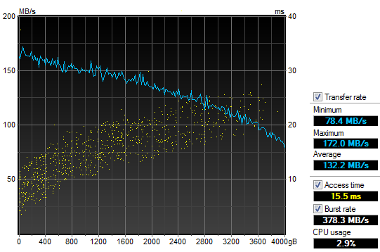 Unfortunately, HD Tune does not generate any fancy independent graph outputs in particular, so I had to edit my screenshot out a bit to make it look better for publishing in a review. Its numbers differ slightly in magnitude than the other program -- probably due to testing algorithms used -- but its performance characteristics are identical in practice. Again, like our HD Tach results on the previous page, the Seagate came in first, followed by Hitachi's Deskstar NAS, and the Western Digital Red in third. As you can see in our screenshot above, the HGST Deskstar NAS 4TB scored an average of 132.2MB/s with access time of 15.5ms. The Western Digital Red WD40EFRX 4TB scored an average of 120.9MB/s with access time of 16.8ms, while Seagate's NAS HDD ST4000VN000 4TB posted a score of 139.3MB/s at 17.9ms in the same test. Again, the HGST Deskstar NAS 4TB's sequential read average was not the highest, but it did come in with the best random access delay.