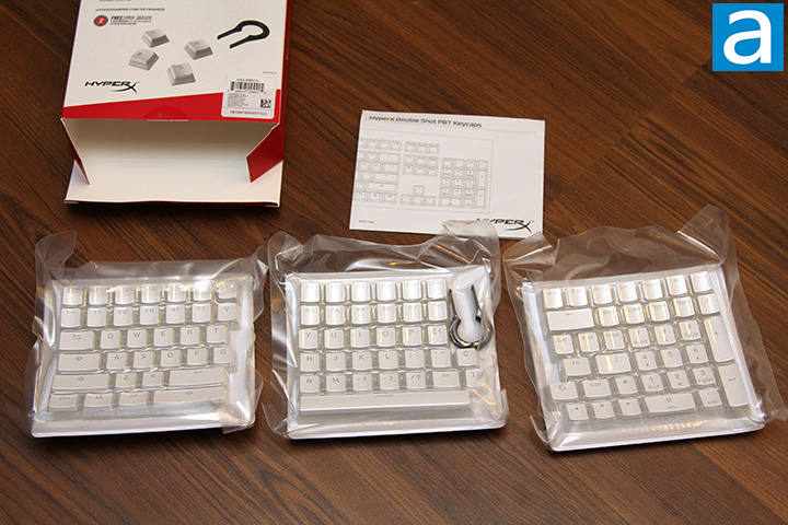 Out of the box, you will receive three vacuum-sealed bag of keycaps along with a keyboard layout diagram. The diagram is a convenient reference after you pulled all the original keycaps off and you are putting new ones on. The keycaps in each vacuum-sealed bag are backed by a cardboard insert to give the packaging a little more strength, and the keycaps are arranged in close order corresponding to an actual keyboard for easy setup. A HyperX-branded plastic keycap puller is included for easy swapping. Personally, I think a metal wire-based puller would have been better, since plastic ones sometimes have a hard time pulling, not to mention the tabs at the bottom could wear out quickly.