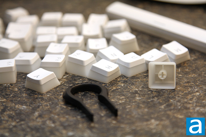 Here is a closer look at some of the keycaps. If you are unfamiliar with different types of keycaps, the most common one found are made out of acrylonitrile butadiene styrene (ABS) plastic. The HyperX Double Shot PBT Keycaps we are reviewing today, as its name suggests, are made out of polybutylene terephthalate (PBT), which are stiffer, harder, and has better color retention. Compared to the stock ABS plastic keycaps, the PBT keycaps have a thicker top, but the sides are of the same thickness. The pudding design with sides that are translucent white are there for better light spreading and diffusing compared to opaque models, while the top is solid white. The white version is actually a new release from the company. It is also available in solid black with translucent white sides if that is your jam.