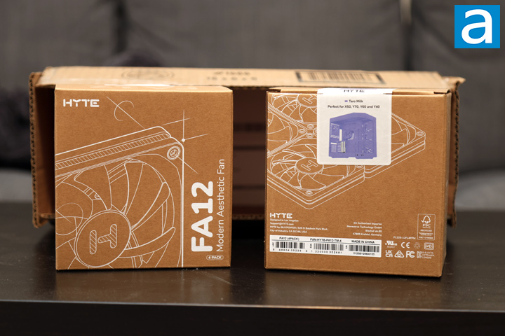 Today's review unit of the HYTE FA12 arrived from HYTE's American headquarters in City of Industry, California, USA. Traveling with UPS and their Standard ground service, this box arrived in average condition. There are bumps and bruises on both sides of the corrugated cardboard box. Hopefully, there was no damage to the items inside. HYTE graciously sent us not one, but two sets of their four pack for a total of eight FA12 fans in the Taro Milk color variant.