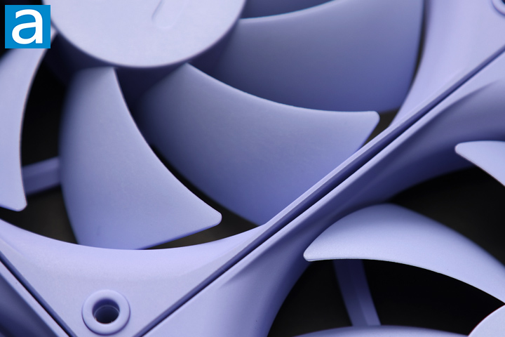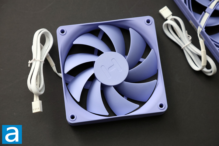 As I have mentioned on the previous page, the lineup of HYTE FA12 fans are so users can acquire color matching fans with their HYTE cases, as these align with all their ATX-sized cases, including the X50, Y70, Y60, and Y40. For our Taro Milk variant, only the HYTE X50 and Y70 come in this purple. Even so, it is nice to see case manufacturers not only offer cases with so many colors, but also to make their add-on accessories like fans also match exactly. I really appreciate how unapologetically purple it is. The whole unit, from the frame to the impeller, is the same shade. The only thing that does not match is the white cable, and while I could criticize for this omission, I am still happy to see most parts of the unit in one shade. Also, HYTE has not put some mismatched labels in black or white on the fan either, as you will see on the other side. I also think this Taro Milk stands out, as few other companies make purple products. The HYTE "H" logo is in the middle of the fan. On each corner, you can see the screw mounting holes have a color-matching rubber insert inside to damp vibrations between the fan and the case.
