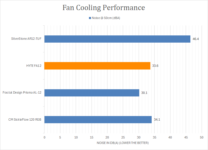 I measured the noise output of the fans spinning at maximum speed from the input side. As can be seen in the graph above, the HYTE FA12 fans were in the middle of the pack with a 33.6dB(A) measurement, and just so slightly quieter than the Cooler Master SickleFlow 120 RGB fan at 34.1dB(A). The Fractal Design Prisma AL-12 fan was the quietest of the bunch, but it also produced the least airspeed too. On the other hand, the SilverStone AR12-TUF fan was the noisiest at maximum speeds.