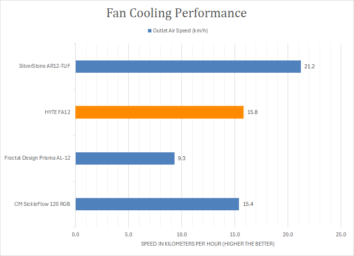 With no obstruction at the fans output, the HYTE FA12 produced fan speeds of 15.8km/h or 9.8mph. This is just slightly above the output air speed of the SickleFlow 120 RGB. Considering the FA12 has a lower RPM but higher airflow numbers, these results are not too surprising.