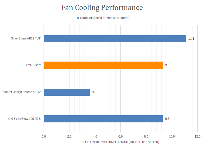 With the heatsink attached, all the air speeds reduced notably, but again this is not a shocker. The HYTE FA12 produced a 9.3km/h or 5.8mph, which was the same number as the SickleFlow 120 RGB. Unsurprisingly, the SilverStone AR12-TUF fan produced the highest air speed, which is expected given this fan is designed as a tower cooler fan for this specific heatsink.