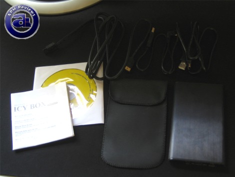 Out of the box, there's a nice bundle of included accessories. Besides the Icy Box 2.5" enclosure itself, also included is a USB mass storage device CD for older operating systems, a brief manual, a USB power cable, USB data cable, as well as an eSATA cable. Also included is a small pouch to hold and protect the Icy Box enclosure for traveling.