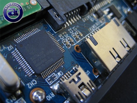 The construction is rather simple. Internally, in the part as displayed in our photo above, shows an array of circular pits to allow breathing room for the hard disk. The controller/adapter board resides on one side installed with a two screws. A couple wires are led to the front of the Icy Box enclosure to support two LEDs. The wires are held to the side through utilization of several hooks.