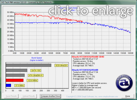 Consistent read speed for USB 2.0 is actually one of the best I've seen at 34.7 MB/s, when compared to the eSATA performance of 38.7 MB/s. However, eSATA is controlled by the motherboard rather than a controller on the enclosure -- so it remains a good reference of what kind of performance level is seen using USB and how much it may be limiting drive performance. On the other hand, I have tested the drive using HD Tach 3.0.1.0 in my laptop with an ICH7M southbridge and obtained very similar results as the eSATA line graph as displayed in our screenshot above.