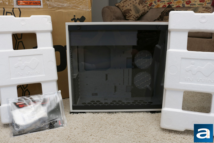 The steps taken to ensure the safety of the In Win 101 was sufficient. After opening up the box, I was met with two Styrofoam blocks on either side of the case, and the chassis was also placed in a plastic bag. The Styrofoam blocks did a good job in keeping the case from moving around, while the plastic bag prevented dust or some more serious damage to the surface like scratches. Unfortunately, there was no covering for the tempered glass, but the glass was clean when I received it. Also found in the packaging was a medium sized plastic bag. Inside of this bag was the manual and the screws for installation, as well as some zip ties for cable management. Regardless of the ugly dent in the shipping box, everything still arrived in good condition.