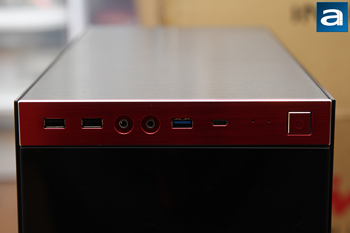 The In Win 805's front panel connectors are literally on the front panel, rather than on top like many new chassis. It is highlighted by a sharp red strip in our particular model variant, but you can also buy it in yellow or black -- kind of a little too out there and too mainstream, respectively, in my opinion, haha. The layout configuration is pretty standard; starting from the left, we have two horizontally oriented USB 2.0 ports, two 3.5mm audio jacks for microphone in and headphone out (But neither of them are labeled -- a curious omission), USB 3.0, USB 3.1 Type-C, orange HDD activity LED, blue power LED, as well as a square power button. Like the audio jacks, the LEDs are not labeled either, but at least it is not hard to figure out which one is which.