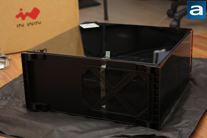 Large plastic brackets with small rubber feet can be seen at the bottom of the In Win 805. The legs provide the chassis about 2 cm rise over the surface it resides on. For those who want more fans in their systems, the bottom panel has room for two additional 120mm fans, given you remove the internal hard drive cage. The magnetic washable fan filter takes out the nasty stuff for all intake fans, and can be seen in our photo above, which can be pulled out for easy cleaning.