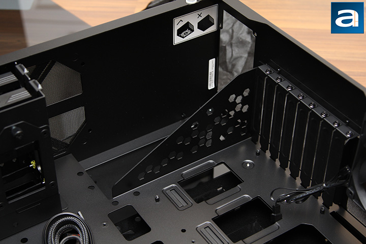 As shown in our photo above, we can spot a large rectangular opening on the motherboard tray for easy aftermarket heatsink backplate installation without removing the motherboard itself from the chassis. The opening is actually large enough to accommodate pretty much anything. I mean, with something this big, unless you have some wacko motherboard, it is hard not to get it right. The perimeter of the opening is not lined with anything, but the tray is plastic and is well rounded off, so you do not need to worry about your cables being stripped accidentally.