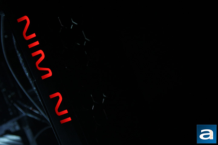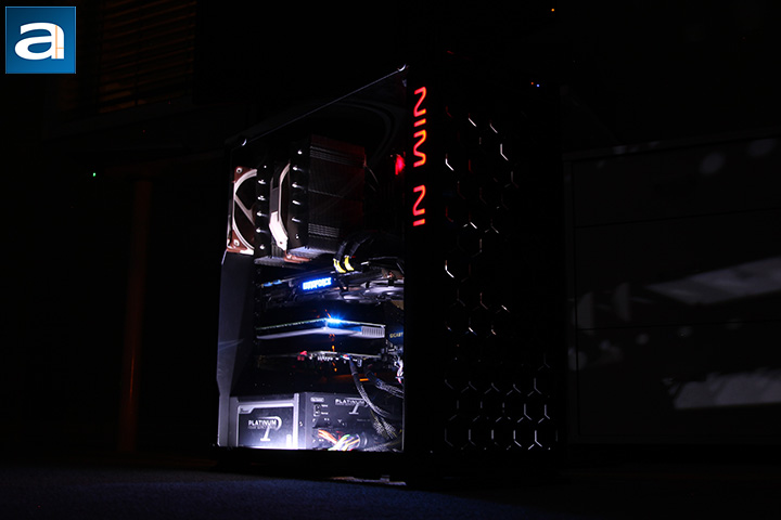 After plugging in everything, our system configured inside the In Win 805 was ready to roll. I hit the square power button in front, and my computer came to life. With some LED lights inside, I was blown away by its looks. In Win's logo on the side also lights up to add to the dramatic effect.