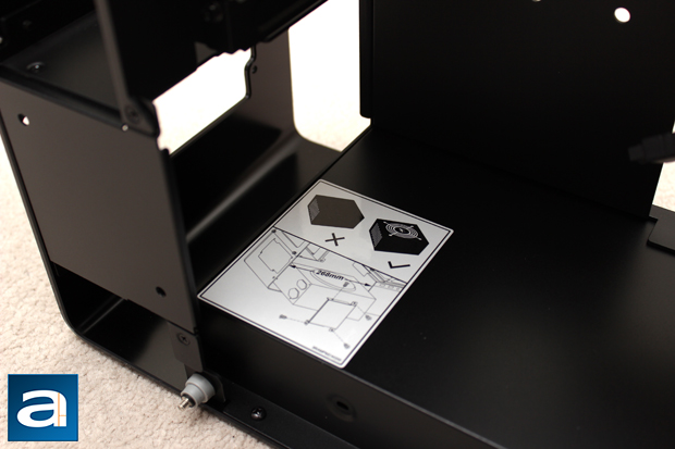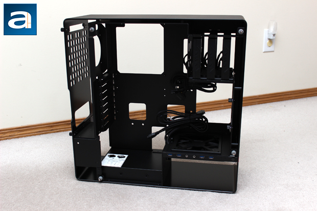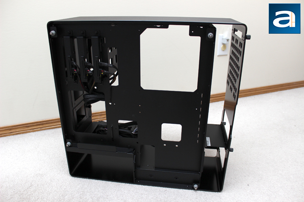 Removing the glass from the sides is quite simple, especially with the four thumbscrews on each side. On an aside, it is a bit of a misnomer to call them thumbscrews, as the threaded extended bit actually extends from the case. These would be more like thumbnuts, but I changing terms would be more of a hassle than it is worth. Either way, these tool-less implementations are easy to remove, and reveals more attention to detail by In Win. Each screw holding it is wrapped by rubber, so the glass does not scratch or vibrate against each screw. Inside the case, everything is coated in a matte black finish, which looks great again. The first thing you might notice is how large the hole is behind the motherboard. This is found on many cases; both budget and high-end. It allows users to install an aftermarket CPU cooler much easier, as they can access both sides without having to remove the motherboard from the chassis. As mentioned prior, the In Win 904 Plus is a mid-tower ATX case, but it can support mATX motherboards too. The riser mounting holes are pre-installed with an ATX motherboard in mind, but these can be easily swapped later on. The rest of the layout is generally traditional, but each part is also a bit different in its own way.