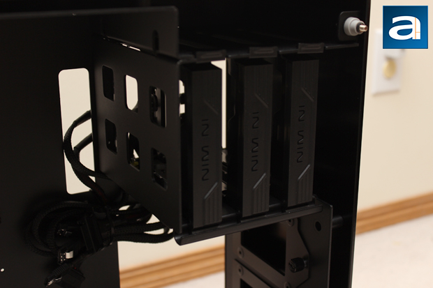 Moving to the top right hand side, we can get a glimpse of the disk drive trays integrated into the In Win 904 Plus. This tray area is one of the few areas were we see plastic in the 904 Plus, but there is no real reason why it should be anything other than plastic. The trays open up by unhinging the clip at the top. Then you can easily slide it out and install your drives. Each of these trays can fit either a 3.5" or 2.5" hard drive or solid state drive. In Win has promised tool-less installation for 3.5" drives, but we will see if this holds true during our installation. To do so, they have placed four rubber-wrapped holders to hold the hard drive in place. The rubber also reduces the vibration often found in drives with moving parts. Otherwise, a nice thing they have done is how they have placed a plug at the back integrating the SATA and power cable together. This is quite useful, as it would be very tight to put your own cables through on the other side. This integrated solution actually works quite well, while keeping the cables relatively tidy. The cables are braided to keep them durable and flexible while bending around the case. There are also two more metal plates underneath the drive bay, where you can attach more 2.5" drives via screws. As more and more people are moving away from the traditional spinning disk, adding more mounting areas for solid state drives is a solid idea -- no pun intended. The overall placement of the drive bay is quite handy, as it will not get in the way of most components like graphics cards. Since the optical drive bay is located elsewhere, In Win has taken full advantage of what would be a void space.