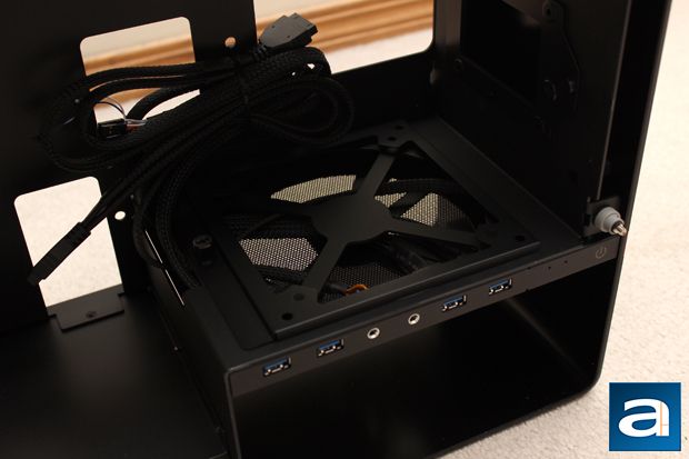 Where the drive bay would traditionally be, we find one of the fan filter areas. Unfortunately, while there is a filter and a place for a fan to fit, there is no fan to be found. I looked around in the shipping container and the resealable bag to see if they had just not installed it, but they were just not there. For a case of this class and price range, I would have expected at least one, if not two cooling fans, but neither are present. This is just a filtered area where you can put a 120mm or 140mm cooling fan. An additional area for a 92mm fan is located at the back for the exhaust. I would have hoped for a larger exhaust fan space, especially since the standard today is either a 120mm or 140mm exhaust. Not to mention, this case does not have a lot of open ventilation either. The filter itself is quite well made, and can be removed, since it is held by magnets. While we are on the topic of cooling, there also is support for an all-in-one water cooling unit, but it is limited to a 120mm or a 140mm radiator. The case can also fit a CPU cooler with a rated maximum height of 145mm. Otherwise, you can see the input and output cables are located here and are braided, which is nice to see. As I have explained before, braided cables should be more flexible and durable, so this is good to see.