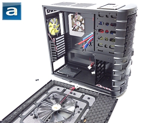 Removing two thumb screws, we can now slide the side panel out to get a good look at the interior design of the In Win Dragon Rider. Although the exterior is not exactly to my taste (Again, this is subjective), I am pleased to say that the interior is actually very well designed. It is painted matte black all around. Also, we can see the 220mm LED fan below provided by In Win mounted on the mesh panel. Larger fans tend to be a cooling enthusiast favorite, because they typically move more air at lower speeds. For the Dragon Rider, you really never need to be worried about overheated components with a 220mm fan taking fresh air into the system. However, aforementioned in the previous page, I really wish In Win had spent the time to install more fan filters. I would also like to see In Win tone down on the overall area covered by the mesh. I doubt anyone would ever spend $60 or more to install a matrix of six 120mm fans to replace an already provided 220mm LED fan. So with that said, In Win should really take out the unused mesh that would just sit there collecting more dust, and change the mounting options to allowing 140mm configurations; generally something a little bit more toned down than the current option.
