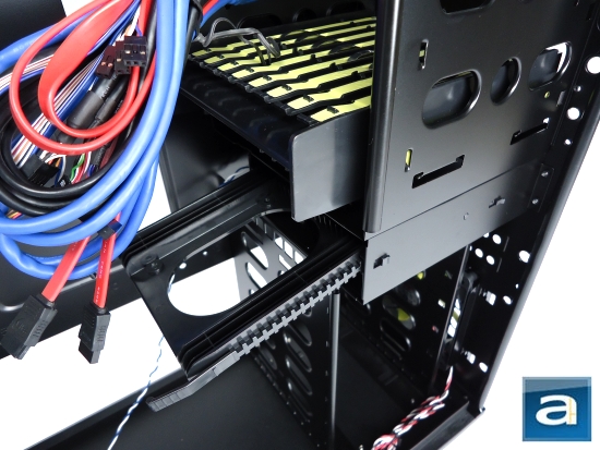 You can observe the interior positioning of the 5.25" container that stores all the 3.5" and 5.25" drive rails. As mentioned before, I ended up taking this container out, just because I found the feature to be useless. It takes up space, adds more weight, could possibly lessen airflow, and no one can see it.
