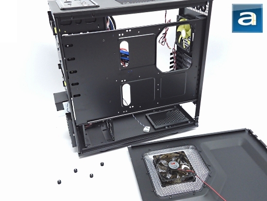 The inner side of the side panel also has some foam lining for sound isolation. However, I really am quite disappointed in this. From the above image, you can see that the foam provided is pretty much packaging foam. In fact, In Win does not even install the foam using one sheet, and instead uses several cut out pieces to just glue onto the side frame. The result is ugly, cheap, and pieced together as if it were a high school project, oh snap. Also, with a mesh panel that measures over 12x12" with a 220mm fan mounted right on it, what is a little bit of foam going to do? It is almost as if In Win decided to leak-proof the side hull of a submarine, while leaving a huge gaping hole at the bottom.