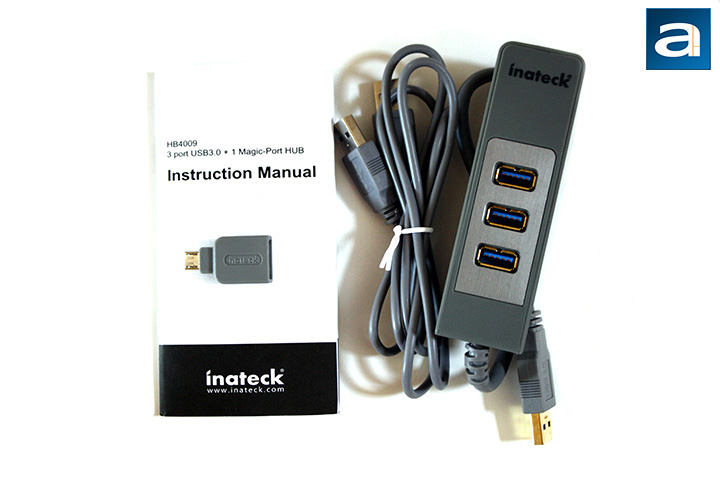 As mentioned, the box Inateck chose to use is very simple, with a single flap design. Upon lifting the tabs on the side of the box, you will find the Inateck HB4009 with its cables neatly wrapped and bundled to its side. Along with this are the accessories that complete the unit as a whole, including the additional USB 2.0 cable, OTG adapter, and product manual. All of the contents mentioned above are organized extremely well to fit inside the box, and was easy to see without having to flip through it.