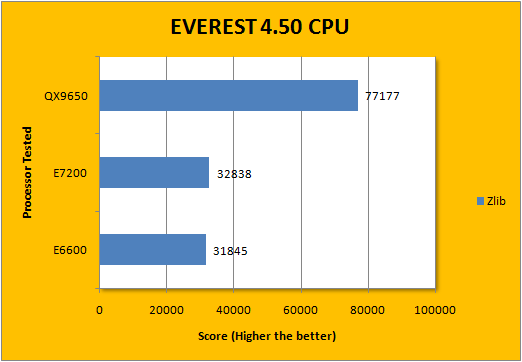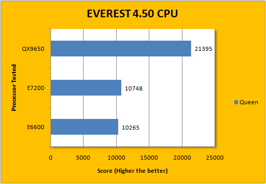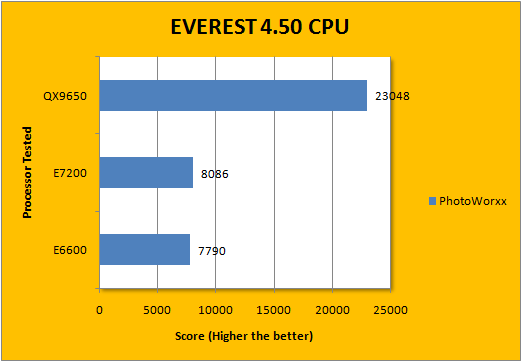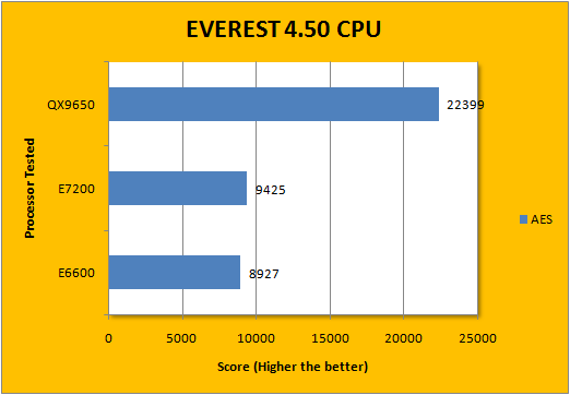 The Intel Core 2 Extreme QX9650's performance in this context is nothing short of incredibly impressive. Of course, EVEREST CPU is a multithreaded benchmark set, which will favor CPUs with two more cores as we can see here. The quad core offered more than twice the performance as the budget-minded Intel Core 2 Duo E7200, simply because of its higher clock, more cache, and twice the amount of processing cores.