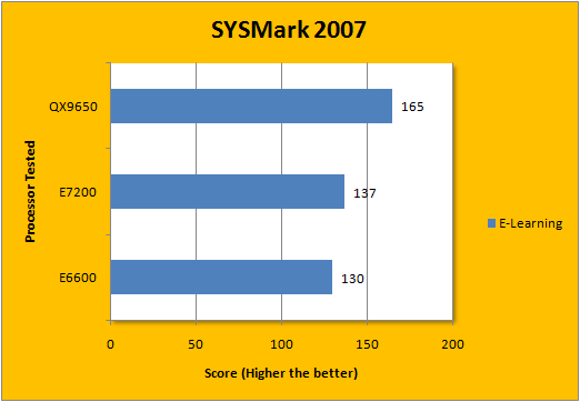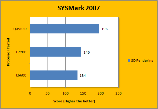 SYSmark 2007 Preview is an application-based benchmark that reflects usage patterns of business users in the areas of Video creation, E-learning, 3D Modeling and Office Productivity. This new release includes a robust and refreshed set of applications. The SYSmark family of benchmarks are used by PC OEMs, hardware and software developers, IT departments, system integrators, publishers and testing labs as well as Information technologists and computer industry analysts.