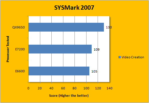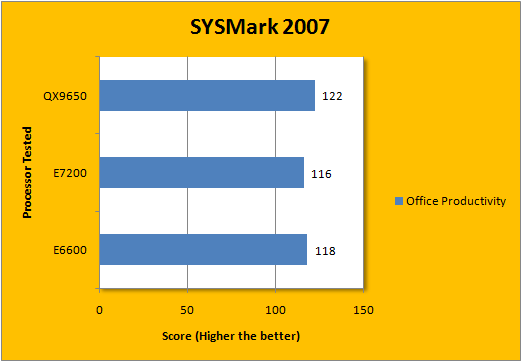 Now, for our favorite benchmark set -- SYSMark 2007 Preview. SYSMark 2007 uses real life benchmarks to obtain real life performance scores, thus not a synthetic benchmark (Although, to be honest, I do have a thing for synthetics as it can narrow down performance differences on stuff such as motherboards). Anyways, most people would probably be interested to see the real life performance of something so performance oriented like a processor. In this set, the QX9650 was 20.4% faster in E-Learning, 19.2% faster in Video Creation, 5.2% faster in Office Productivity, and 35.2% faster in 3D Rendering as compared to the E7200. Please note that this benchmark set didn't really take full advantage of the quad core, but the performance difference is there.
